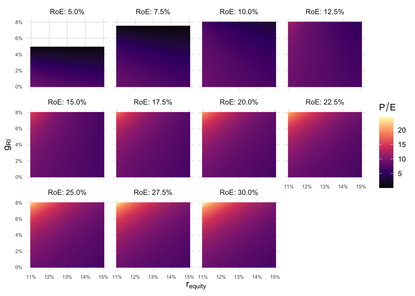 - Generally P/E is highest for high growth relative to risk (the upper left corner). Profitability has a positive moderating effect. Higher return on equity “bends” the plane further upwards by the upper left corner. The only exception (unsurprisingly) are those facets where RoE < r. In this case residual income–the abnormal profits–are negative. Which means the company is destroying value. Higher growth just means the company is destroying value faster, which is why the PE plane curves down with higher growth for the RoE < r cases.